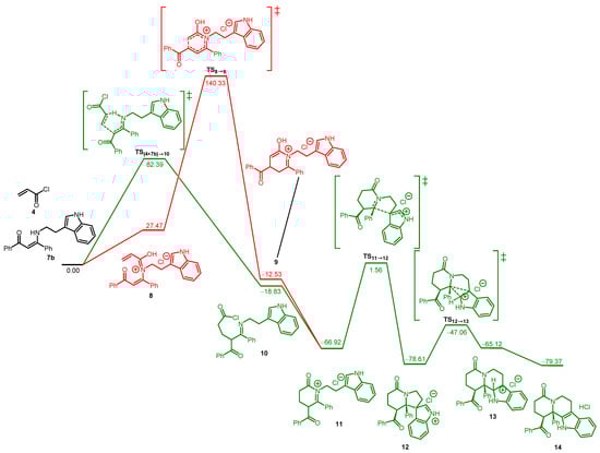 Discrimination between both plausible alternatives for the aza-anellation Pictet–Spengler sequence can be made by calculation of the transition state energies of both pathways, namely via the envisioned initial pericyclic steps. As a computational model, diphenyl-substituted enaminone 7b and acryloyl chloride (4) were chosen as starting points and DFT calculations with Spartan ‘18 were performed, employing the standard B3LYP hybrid functional and the 6–31G* basis set using the conductor-like polarizable continuum model (C-PCM) [34] with a dipolar aprotic implicit dielectric medium with a dielectric constant of 37.22 (e.g., DMF) to mimic the mixture of dichloromethane and acetonitrile (Figure 4).