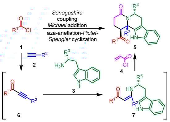 - Karpov, A.S.; Rominger, F.; Müller, T.J.J. A diversity oriented four-component approach to tetrahydro-β-carbolines initiated by Sonogashira coupling. Org. Biomol. Chem. 2005, 3, 4382–4391. [Google Scholar] [CrossRef] [PubMed]