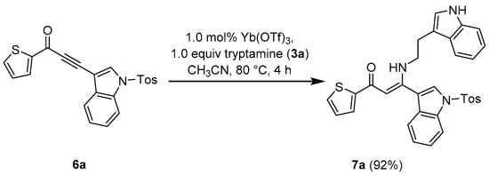 Optimized model reaction of the ytterbium triflate catalyzed Michael addition of ynone 6a and tryptamine (3a) to give enaminone 7a.