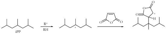 The tertiary hydrogen atoms of the PP are relatively liable and can be made to react with reactive unsaturated molecules under radical initiation, either in solution or under melt conditions, which is often referred to as a grafting reaction (Figure 1). The latter is very commonly used, for example, with maleic anhydride on commercial scales, with the aid of a twin-screw extruder to produce malleated PP. Owing to the enhanced polarity of malleated products, these are often used as compatibilisers for PP with a relatively higher number of polar substrates [5]. Depending on the nature and activity of the grafting reagent, and the prevailing reaction conditions, the degree and extent of the grafts can vary.