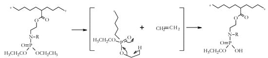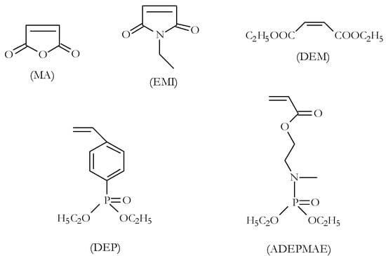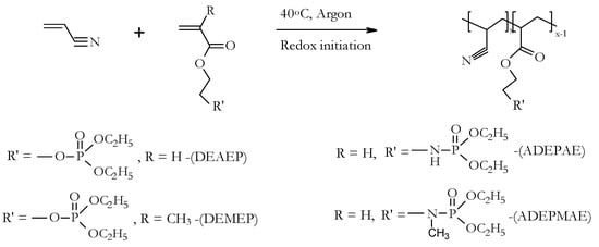 P-containing comonomers, diethyl-2-(acryloyloxy)ethyl phosphate (DEAEP) and diethyl-2-(methacryloxy)ethyl phosphate (DEMEP), were synthesized via condensation of diethylchlorophosphate with 2-hydroxyethyl acrylate and hydroxyethylmethacrylate, respectively [23]. The detailed procedures for the preparation of P- and N-containing comonomers—i.e., phosphorylamino esters, acrylic acid-2-(diethoxyphosphorylamino)ethyl ester (ADEPAE), and acrylic acid-2-[(diethoxyphosphoryl)methyl amino] ethyl ester (ADEPMAE)—were described in our previous publication [12]. The typical yields of the synthesized comonomers, after purification, ranged from 50 to 98%.