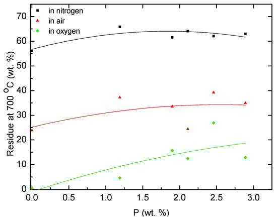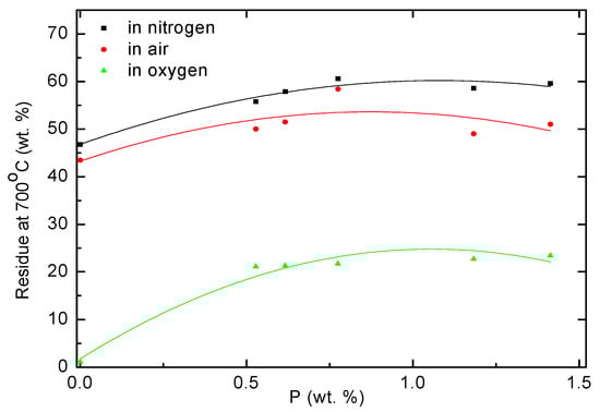 Plots of char yields of poly(AN-co-ADEPMAE) vs. P contents (obtained from TGA runs in nitrogen, air and oxygen).