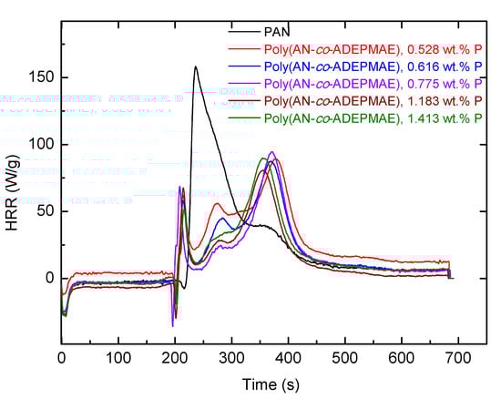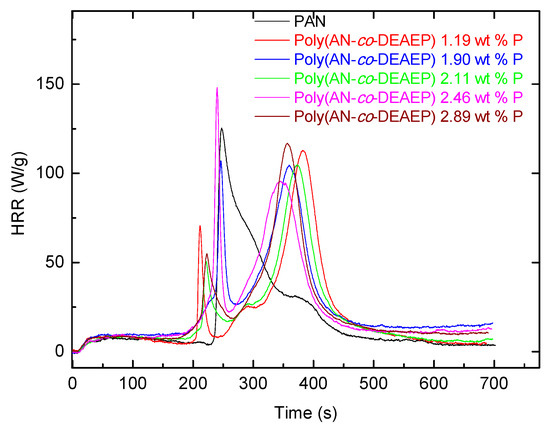 Indeed, the PHRR values, for example in AN/ADEPMAE copolymers, decreased by about 40–48% compared to the unmodified PAN. Furthermore, there were marked differences in the general profiles of the HRR vs. time curves. Evidently, the chemically modified systems showed an earlier shoulder peak, which can be attributed to the combustion of volatile fragments produced upon the thermal cracking of the P- or P/N-bearing groups. Subsequently, a shift and suppression of the main peak were also observed, which were thought to arise from the combustion-inhibitory effects exerted by the modifying groups. These effects can be also responsible for enhanced char production, as was observed in almost all cases compared to the virgin sample. For AN/DEAEP polymeric systems, the decrease in values of PHRR was less pronounced: a reduction of 10–34% was observed. An incorporation of a very nominal loading of P/N-containing monomeric units (0.009 mole fraction or 0.528 wt.% P) into polymeric chains leads to significant decreases in PHRR and HRC values by almost half (Table 3). This can be attributed to possible phosphorus–nitrogen synergism operating in this modified system. Furthermore, the temperatures of peak heat release were substantially higher in the case of copolymers than PAN (by about 120–140 °C). The most significant improvements in flame retardance were recorded for copolymers containing a 0.059 mole fraction of DEAEP monomeric units (2.890 wt.% P) and a 0.027 mole fraction of ADEPMAE units (1.413 wt.% P). As for char production tendencies, gauged from the remaining residues (wt.%), the general trend registered from the TGA experiments correlates well with that observed from the PCFC runs. Heat releases associated with a possibly earlier induction of degradation, in the case of both types of copolymers, were also evident, as shown in the plots of Figure 10 and Figure 11.