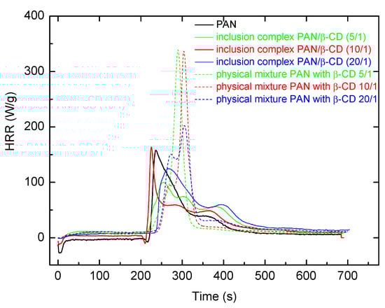 Plots of heat release rates for samples of PAN, inclusion complexes of PAN with varied amounts of β-CD, and physical mixtures of PAN with β-CD.