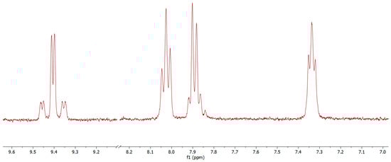 The 1H NMR spectrum of 8 displayed nine signals belonging to the aromatic protons in the range of 5.5–10 ppm (Figure S11), counting for 15 protons. The doublet at 5.69 ppm corresponds to the proton in ortho position of the cyclometallating carbon of the tolylpyridine ligand, which is in the magnetic field of the N^C^N ligand. As a consequence, the chemical shift moved to a high field. Two singlets in the aliphatic region correspond to the methyl groups of both cyclometallating ligands. The NMR spectrum displays the expected number of protons.