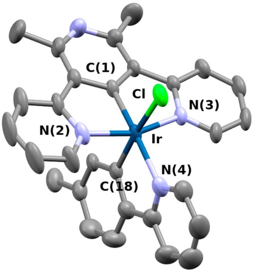 Crystallographic quality crystals were obtained for 8 by slow vapor diffusion of n-hexane in a concentrated solution of the complex in 1,2-dichloroethane. The structure is shown in Figure 2. Compound 8 crystallizes in the triclinic space group P-1 with one complex per asymmetric unit. A selection of structural data are gathered in Table 1 and the crystal data and structure refinement are shown in Table S1. The geometrical constraints induced by the chelation of the terdentate ligand forming five member cycles lead to a distorted octahedral geometry coordination around the metal center, with an NNCN^Ir^NNCN angle of 160.5°. The metal–ligand bonds are longer for the bidentate ligand than for the terdentate one, Ir-CNCN is 1.919(9) Å and the Ir-CNC is 2.019(6) Å; such a difference could be the result of the hindrance of the two flanking pyridyl rings of N^C^N ligand on the other ligand. Ir-NNC is 2.160(7) Å, longer than the other Ir-N bonds, which display bond length of roughly 2.05 Å. This difference reflects the trans effect induced by the strong σ donating ability of the cyclometallating carbon. These values are similar to the one encountered in other iridium(III) complexes featuring the cyclometallating terdentate ligand [56,62,63].