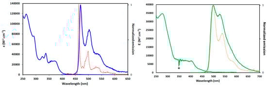 The absorption spectra were recorded on a Cary 300 UV−visible spectrophotometer (Varian) and the emission spectra (in solution and at 77 K) were recorded on a Fluoromax 4® (Horiba) or on a FLS-1000® (Edinburgh Instruments) equipped with automatic filters to remove the harmonic bands. Quartz cuvettes with a 1 cm optical path were used. Lifetimes were measured using LP900 spectrometer with a Flashlamp pumped Q-switched Nd:Yag laser operating at 355 nm and with photomultiplier (PMT) detector, or with a picosecond laser diode operating at 405 nm and using a time-correlated single photon counting detection (TCSPC, PicoHarp 300). Phosphorescence quantum yields Φ were measured in diluted solutions with an optical density lower than 0.1, using the relative method (comparison with a reference compound, here diphenylanthracene in cyclohexane, Φr = 0.90), according the following general equation: Φx/Φr = [Ar/Ax][nx2/nr2][Dx/Dr], where A is the absorbance at the excitation wavelength, n the refractive index, and D the integrated luminescence intensity. “r” and “x” stand for reference and sample, respectively [54].