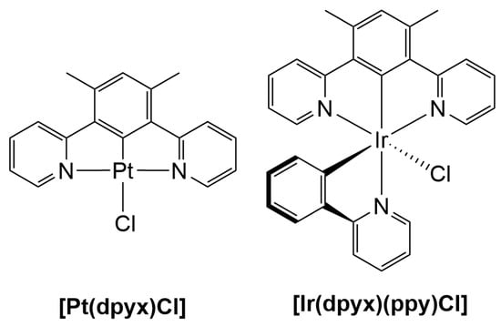 Cyclometallated iridium(III) and platinum(II) complexes become cornerstones in modern photochemistry and find applications in optoelectronics, sensors, and luminescent biological probes for confocal microscopy, to name a few examples [1,2,3,4,5,6,7,8,9,10,11,12,13]. Cyclometallation means the formation of a bond between the metal and a carbon atom of a polydentate ligand, with the remaining bonds to the metal center usually being formed by heteroatoms such as nitrogen atoms. These complexes are thus organometallic compounds. The archetypical ligand being 2-phenylpyridine (ppy) reacts efficiently with PtII and IrIII forming five-membered metallacycles, in which the carbon atom of the phenyl in the ortho of the linking pyridine is bound to the metal. The C-H activation generates a carbanion C-, for which the σ donor ability is strong, while pyridine is a π acceptor. This ligand provides a very strong ligand-field to the metal, and thus the photophysical properties of the excited state are greatly enhanced. Indeed, in comparison with the polypyridines analogues, the strong ligand field uses high energy to push to a metal-centered (MC) excited state. This MC state is strongly coupled with the ground state and is thus responsible for the very low emission quantum yield when thermally accessible, such as in the case of RuII, FeII, and OsII complexes [14,15]. These complexes’ emission quantum yields are below 10%, with a few exceptions [15,16]. Tgherefore, it is not surprising that cyclometallated IrIII and PtII complexes have been studied or are used in numerous applications, such as triplet emitters in electroluminescent devices [1,2,3,4,5,6,7,8,9,10,11,12,13,14,15,16,17,18,19,20], sensors [21,22,23,24,25,26], theragnostic and/or therapeutic agents [27,28,29,30,31,32], and photosensitizers and photocatalysts [13,21,33], to name few examples. The modification of the ligand framework around the metal center(s) allows for fine tuning their emission properties that cover the full visible spectra up to the near infrared [34,35,36,37,38]. Cyclometallated IrIII complexes are usually encountered as part of one of the following three families: neutral trishomoleptic Ir(C^N)3, where C^N is a cyclometallating ligand such as ppy; neutral or cationic bisheteroleptic Ir(C^N)2L, where L can be a monoanionic such as acetylacetonate (acac) or a neutral bidentate such as bipyridine (bpy: 2-2′-bipyridine); or trisheteroleptic complexes with three different cyclometallating ligands [39,40], or of the form Ir(N^C’^N)(C^N)Cl, where N^C’^N is a terdentate such as bipyridylbenzene. The PtII complex counterparts, when limited to cyclometallating compounds, can be divided into four main families, namely: Pt(C^N)L, with the L ancillary ligand, which can be anionic (acac) or neutral (bpy); Pt(N^C^N)X; the isoelectronic Pt(C^N^N)X; and Pt(C^N^C)X (X: halogen, thiocyanate, etc.).