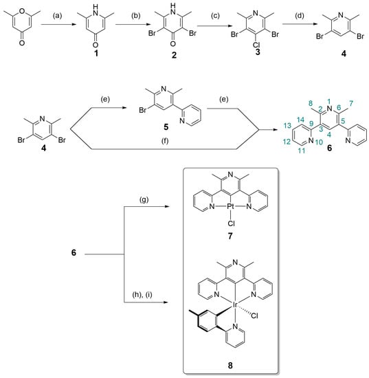 The synthesis of the dipyridylbenzene-like terdentate ligand 6 (Scheme 1) was adapted from known procedures [55,56] and started from the conversion of 2,6-dimethyl-γ-pyrone into 2,6-dimethyl-4-pyridone (1) in a pressure tube in the presence of an excess ammonia aqueous solution at a high temperature, with a moderate conversion yield (60%). The dibromopyridone 2 was obtained through the addition of bromine to an alkaline solution of compound 1, which provided access to the desired derivative in a moderate yield (68%). The aromatization and conversion of compound 2 to 3 was performed in neat phosphoryl chloride at a high temperature in a pressure tube. After neutralization of the reaction mixture and extraction, the desired compound 3 was obtained after flash chromatography column in good yields (73%). The reduction in the chlorine atom was performed in a refluxing hydroiodic acid in the presence of red phosphorus and the subsequent neutralization and extraction gave a crude material. The latter was purified by a flash chromatography column, yielding 4 (65%). To our surprise, the direct conversion of 4 to 6 by the Stille palladium cross-coupling reaction appeared to be somewhat slow. Indeed, the 1,5-dimethyl-3,4-di(2′-pyridyl)benzene synthesis in similar conditions [56] was obtained after 24 h of reaction in a moderate yield (61%) from the corresponding 1,5-dibromo-2,4-dimethylbenzene. In our case, when the work up of the reaction was performed after 24 h, the column chromatography allowed for isolating two compounds, the first eluted compound was the monosubstituted derivative 5 and the second one was compound 6, in 65% and 24% yields respectively. A second cross-coupling reaction with 5 provided access to 6 in 45% yield, after purification. The direct access to the desired ligand through the cross-coupling reaction required three days of reflux with a slight increase in the Pd0 load, 7% instead of 4%. The ligand was obtained in a high yield (87%) after column chromatography. When performing the cyclometallation reaction to afford complex 7 from the refluxing solution of 6 and K2PtCl4 in a different set of solvents acetic acid, or 2-ethoxyethanol, or in a mixture of solvents (CH3COOH/CH3CN), only degradation materials or starting ligands were observed. Therefore, we attempted the in situ formation of a bis(butyronitrile)dichloridoplatinum(II) complex that would react with ligand 6 [57]. After 60 h of reflux of a mixture of ligand 6 and K2PtCl4 in butyronitrile, the reaction was filtered, and the filtrate was free of materials and the celite displayed a pale yellow color. No product was recovered after washing the celite with hot CH2Cl2. We presumed that the cyclometallation did not take place and the celite was refluxed for 24 h in 2-ethoxyethanol to allow for the cyclometallation to take place. After filtration and washing of the solid, the pure compound was obtained by treating the celite with hot CH2Cl2 and CH3NO2, as a pale yellow to red solid in a low yield (21%). It is worth noting that the presence of a red color, along with a red emission, is characteristic of Pt─Pt interactions in the ground state in this family of square planar complexes [58]. The synthesis of complex 8 followed the classical two steps route [37,56]; first, ligand 6 was dissolved with IrIIICl3.nH2O salt in a mixture of ethoxyethanol/water and refluxed overnight, leading to a µ-dichlorobriged dimer. The latter was not characterized, which is somewhat common regarding the low solubility of these intermediates [37,56] and their known lack of interesting emission properties [59,60,61]. Thus, the intermediate was directly engaged in the next step and suspended in toluene in the presence of an excess of both 2-tolylpyridine and silver triflate. The mixture was refluxed overnight, and the workup followed by a recrystallisation provided the desired complex in a good yield (61%).