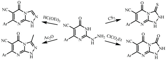 - Agarkov, A.S.; Konorov, G.V.; Nefedova, A.A.; Gabitova, E.R.; Islamov, D.R.; Ovsyannikov, A.S.; Shiryaev, A.K.; Solovieva, S.E.; Antipin, I.S. Synthesis and structure of new derivatives of triazolo[4,3-a]pyrimidine and 2-phenylhydrazones of thiazolo[3,2-a]pyrimidine. Butlerov Commun. 2021, 68, 122–128. [Google Scholar]