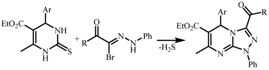- Krezel, I. s-Triazolo[4,3-a] [1,3]diazacycloalkans. III: A novel synthesis of 2-aryl-3-oxo-2,3,5,6,7,8-hexahydro-s-triazolo[4,3-a] pyrimidines. Heterocycles 1986, 24, 93–100. [Google Scholar] [CrossRef]