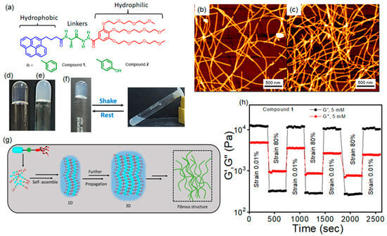Both compounds 1 and 2 formed a self-supported thermoreversible transparent and opaque hydrogel in Milli Q water with critical gelator concentrations of 0.52 mM and 0.82 mM, respectively (Figure 1d,e). Interestingly, both hydrogelators readily converted to sol upon applying the mechanical force while reverting to gel when they were at rest, thus confirming their thixotropic behavior (Figure 1f). The thixotropic behavior of the hydrogel formed from compound 1 was further confirmed by a hysteresis loop rheology test [25]. In this experiment, the hydrogel was subjected to a high strain of 80% for 6 min for a complete gel-to-sol transition and a low strain of 0.01% for a sol-to-gel transition. As shown in Figure 1h, upon removing the high strain, the original mechanical strength of the hydrogel formed by compound 1 recovered by almost 98%, thus confirming its thixotropic behavior. Microscopic characterization using atomic force microscopy analysis revealed the formation of a fibrous microstructure (Figure 1b,c), but dense fibers were observed in the case of compound 1. The proposed nano-model for the self-assembly of compounds 1 and 2 is shown in Figure 1g. As evident from the fluorescence spectra, there are considerable π–π stacking interactions between the two pyrene moieties, which are hydrophobic. Hence, it stays away from the water molecules while the oxyethylene chain remains exposed to the water molecules. These molecules undergo self-assembly to form 1D aggregates, which leads to 3D aggregates upon further aggregation. These aggregate molecules ultimately form entangled fibers, which in turn entrap the water molecules inside it, leading to gelation.
