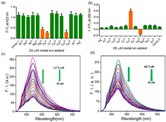 Change in the emission spectra of (a) compound 1 (20 μM, λex = 345 nm) at 422 nm and (b) compound 2 (20 μM, λex = 345 nm) at 470 nm upon the addition of various metal ions (20 μM). Fluorescence titrations of 1 (20 μM, λex = 345 nm) with (c) Cu2+ and (d) Hg2+.