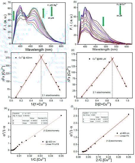 On the other hand, when compound 2 was exposed to various transition metal ions, a distinct response was observed for Hg2+ and Cu2+ (Figure 2b). The addition of Cu2+ induced a 5-fold quenching of the emission intensity at the 460 nm band with a diminution of blue fluorescence (Figure 3b). At the same time, the incorporation of Hg2+ indicated a ratiometric change in emission intensity with the appearance of cyan fluorescence. Further, titration with Hg2+ showed a decreased emission intensity at the 397 nm band with concomitant enhancement at 460 nm (Figure 3a). Here also, the Job plot indicated the formation of a 1:2 complex with Cu2+ (Figure 3d). Similarly, as shown in Figure S3a, Hg2+ showed a 1:1 interaction with compound 2. Further, the binding constants with Cu2+ and Hg2+ were calculated from Figure 3f and Figure S3b based on the Benesi–Hildebrand model for 1:2 and 1:1 complex, and they were found to be KCu2+ = (4.30 ± 0.11 × 1010 mol−1) and KHg2+ = (1.18 ± 0.06 × 105 mol−1), respectively. The minimum detectable concentrations of Cu2+ and Hg2+ for compound 2 were calculated using the blank variation method, and they were found to be 0.065 ppm and 0.232 ppm, respectively [28].