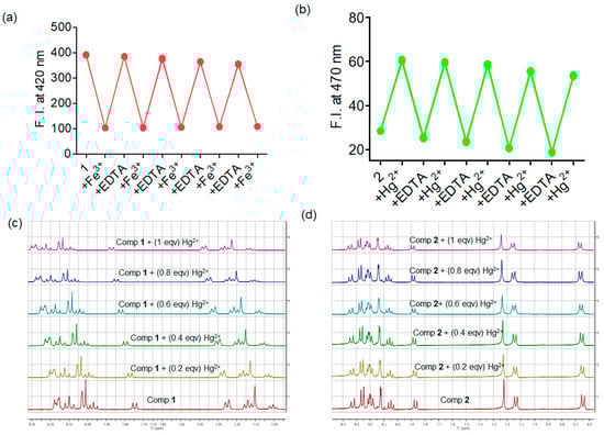 EDTA-mediated recovery plot for the interaction of (a) compound 1 with Fe3+ and (b) compound 2 with Hg2+. 1H-NMR titration of (c) compound 1 and (d) compound 2 with Hg2+ in DMSO-d6/D2O (4:1) mixture medium.