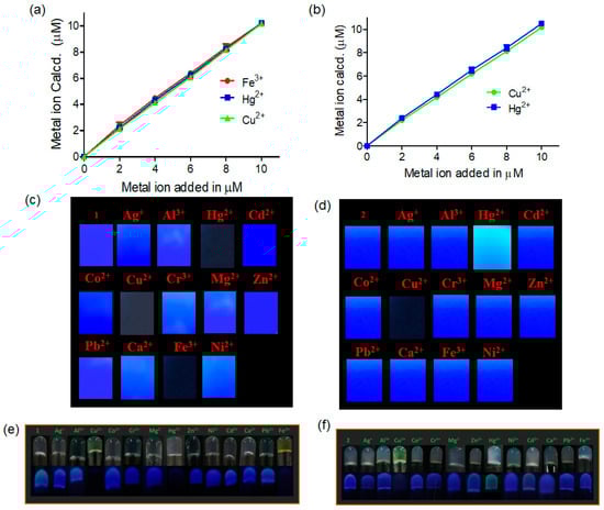 Here, we used water samples collected from laboratory taps to estimate the metal ions. An increase in the metal ion (0–10 μM) concentration led to a gradual decrease in the emission intensity of F/F0 at 422 nm for compound 1 and 470 nm for compound 2, thereby ensuring the quantitative nature of the method (Figure 5a,b). This was further supported by the recovery experiment, as presented in Tables S1 and S2 [28], where we observed that the degree of proportional errors was less than 5% in all the cases.