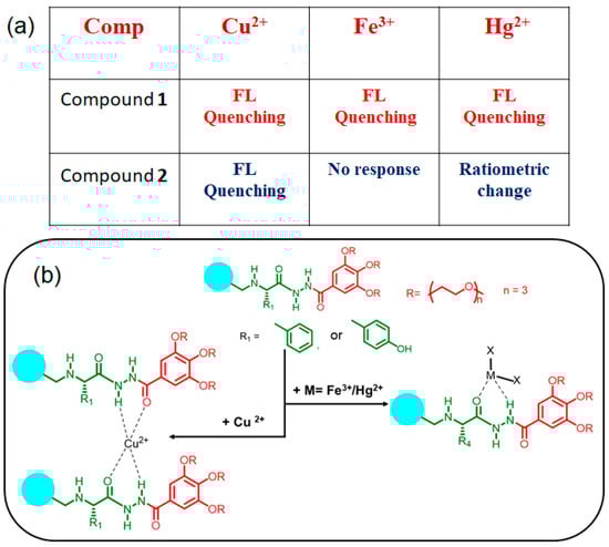 (a) Comparison table for the fluorescence responses generated by compounds 1 and 2 in the presence of multiple metal ions. (b) Proposed mechanism for the interaction between different metal ions with compounds 1 and 2.