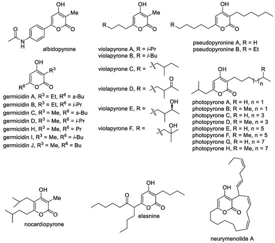 The most common class of natural 4-hydroxy-2-pyrones includes 3-alkyl-substituted molecules, which contain alkyl and alkenyl substituents at the C-6 position and less often substituents at the C-5 position (Figure 3). A large class includes germicidins A–J as important representatives of 3,6-dialkyl-substituted 4-hydroxy-2-pyrones []. These compounds are natural antibiotics that were isolated from Streptomyces bacteria and are responsible for spore germination via inhibition of porcine Na+/K+-activated ATPase []. Related molecules are violapyrones A–F, which bear the methyl substituent at the C-3 position and a long aliphatic substituent at the C-6 position []. They are secondary metabolites of Streptomyces violascens and demonstrate modest antibacterial activity. Another feature of alkylated 4-pyrones is that they can perform signaling functions []. It was reported that photopyrones A–H act as signaling molecules in the cell–cell communication system of the entomopathogenic bacterium Photorhabdus luminescens via the inhibition of quorum sensing. Pseudopyronines A,B bearing long alkyl substituents at the C-3 and C-6 positions isolated from different Pseudomonas strains have antibacterial properties, especially against mycobacteria [,]. It is known that 3-methyl-6-alkyl-4-hydroxy-2-pyrones are included in the M. tuberculosis cell wall as permeability regulators. Pseudopyronines, which are similar to these compounds, selectively disrupt the membrane and inhibit the growth of M. tuberculosis by blocking its fatty acid biosynthesis pathway [].