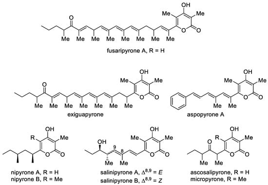 Although natural 4-hydroxy-2-pyrones are usually polyacetates, some polypropionates were found in mollusks, fungi and bacteria []. Fusaripyrone A and exiguapyrone were isolated from the mollusks Haminoea and contain an unusually long chain and form via a regular condensation process starting with propionyl-CoA and continuing with elongation of C3 units up to the linear C30-polypropionates after cyclization []. These compounds can play the role of chemical markers for these marine organisms []. Nipyrones A and B were isolated from a marine sponge-derived fungus Aspergillus niger and exhibit moderate antibacterial efficacy against four pathogenic bacteria []. Salinipyrones A and B were isolated from the marine-derived bacterium Salinispora pacifica. These metabolites are by-products of the PKS system, which is associated with the rosamicin macrolide antibiotics [,]. A related molecule, namely, capsulactone, was isolated from an endophytic fungus Penicillium capsulatum obtained from the leaves of Panax notoginseng and demonstrated weak antibacterial activity (Figure 4) [].