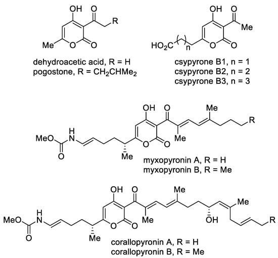 A separate group includes 3-acyl-4-hydroxy-2-pyrones (Figure 5). This class of compounds stands out due to its biological properties. The simplest of this series, namely, dehydroacetic acid, is used as a food preservative (E265) and in cosmetics due to its antibacterial and fungicidal properties []. A structurally similar 6-methyl-4-hydroxy-2-pyrone, namely, pogostone, which was isolated from patchouli oil, inhibits both Gram-negative and Gram-positive bacteria and demonstrates anti-cancer activities []. Furthermore, pogostone can be used as a repellent and insecticide []. Csypyrones B are 3-acetyl-α-pyrone compounds bearing the carboxylic acid side chain as the result of oxidation of the corresponding alkyl substituent and were isolated from the fungus Aspergillus oryzae [].
