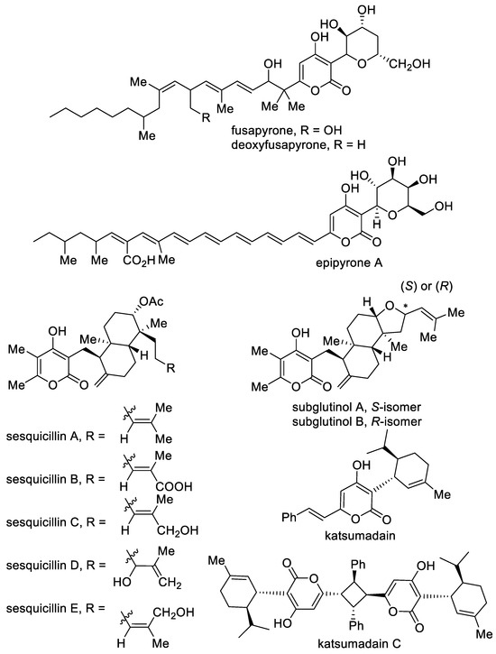 A few 4-hydroxy-2-pyrone conjugates are known to have carbohydrates and terpenes, which are attracted to the C-3 position of the pyrone ring (Figure 6). Such structures exhibit a wide spectrum of biological activity and are an attractive target for total synthesis. Carbohydrate derivatives, namely, fusapyrone and deoxyfusapyrone, were isolated from Fusarium semitectum [,,,]. These compounds show considerable antifungal activity (Botrytis cinerea, Aspergillus parasiticus and Penicillium brevi-compactum) []. Epipyrone A (Orevactaene) is a polyene pigment isolated from Epicoccum nigrum with broad-spectrum antifungal activity [,]. Moreover, this molecule interferes with the RNA binding activity of the regulatory protein Rev in human immunodeficiency virus type I; demonstrates anti-microbial activity; and displays inhibitory activities against cytopathic effect of influenza A virus (H1N1) and NF-κB-dependent gene expression, cysteine and serine proteases [].
