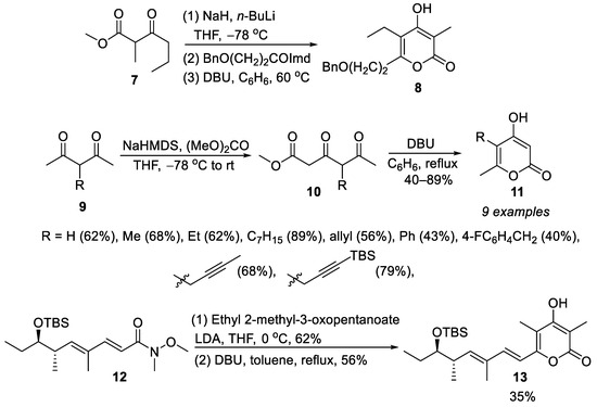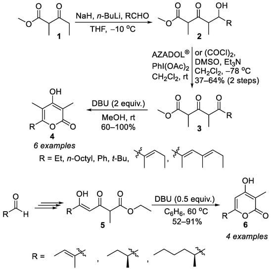 The most common method for the synthesis of 4-hydroxy-2-pyrones is the cyclization of 1,3,5-tricarbonyl compounds or their protected derivatives [,,,,,,,]. This method can be considered as a biomimetic strategy because the same processes occur under the action of polyketide synthases in Nature []. The general approach is based on a condensation reaction of acetoacetic esters with aldehydes at the C-4 position in the presence of sodium hydride and/or n-BuLi with subsequent oxidation. For example, the corresponding ester 1 gives the corresponding products 2, which lead to the diketoesters 3 with the use of AZADOL® (2-azaadamantan-2-ol) and PhI(OAc)2 in dichloromethane (Scheme 1). The DBU-catalyzed cyclization in polar and non-polar solvents produces 4-hydroxy-2-pyrones 4 in 60–100% yields [,]. This method allows for the use of various derivatives of acetoacetic ester, which bear the Me, Et, n-Pr, n-Bu groups at the C-2 position, and aldehydes. However, 2-methylacetoacetic ester is most often used because a few natural compounds based on 3-methyl-4-hydroxy-2-pyrones. Using this approach, the α-pyrones 6 are also synthesized, some of which possess a chiral center in the side chain []. It should be noted that the cyclization of 4-acyl-acetoacetate 5 is carried out in the presence of catalytic DBU (Scheme 1).