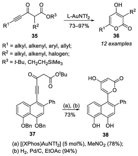 Proposed mechanism of cyclization of alkynyl ketoesters 35 to 4-hydroxy-2-pyrones 36 under the action of gold salts.