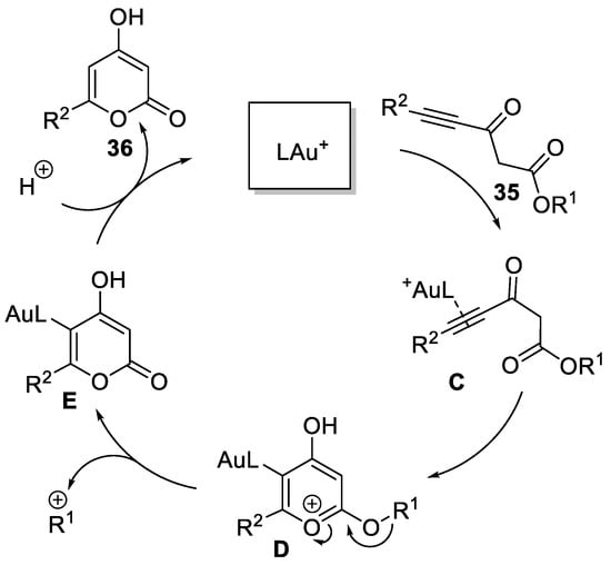 The catalytic cycle starts with the coordination of the gold-based carbophilic catalyst, which is primarily coordinated at the triple bond to form the π-complex C. The next step includes the intramolecular attack of the oxygen atom on the π-complex that leads to the favorable 6-endo-dig cyclization and the formation of an intermediate D. The heterolysis of the O–R bond and subsequent protonation gives 4-hydroxy-2-pyrone 36 and the release of the catalyst (Scheme 8).