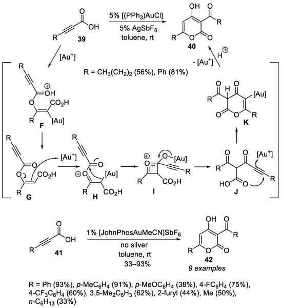 Schreiber et al. showed that 4-hydroxy-2-pyrones 40 can be obtained via the self-condensation of acetylenecarboxylic acids 39 with the use of a gold-based catalyst []. The reaction is carried out in the presence of 5% chloro(triphenylphosphine)gold(I) and 5% silver hexafluoroantimonate(V) in toluene at room temperature. However, only 6-phenyl- (81%) and 6-propyl-(56%) 4-hydroxy-2-pyrone are synthesized in this way (Scheme 9). Later, Ghosh and co-workers [] showed the activity of other gold catalysts with the best result using the JohnPhos ligand, which promotes the transformation of compounds 41 with no silver additive. The scope of this reaction includes aromatic and aliphatic derivatives, and the yields of pyrones 42 range from 33% to 93%. Using this approach, pseudopyronine A is obtained in a 24% total yield over four stages.