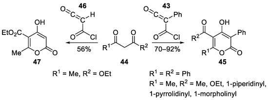 [4+2]-Cyclization reactions with ketenes are involved less often in the synthesis of 2-pyrones []. However, several new examples appeared in recent years. 5-Carbomethoxy-4-hydroxy-6-methyl-2H-pyran-2-one is obtained from malonyl chloride and methyl acetoacetate in a 58% yield []. Similarly, the reaction of stable ketenes 43 and 46 with dicarbonyl compounds 44 afforded 4-hydroxy-2-pyrones 45 and 47 in good yields (Scheme 10) [,]. The reaction scope includes only the available symmetrical diketones and acetoacetic acid derivatives 44. The ketenes are easily obtained from corresponding acid chlorides in situ.