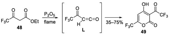 It was also demonstrated [] that CF3-substituted ester 48 gives hexafluorodehydroacetic acid 49 in 41% yield under heating with a flame burner in the presence of phosphorus(V) oxide (Scheme 11). A proposed mechanism of the reaction includes the formation of ketene L, which then dimerizes. Recently, our group [] repeated this synthesis and showed that the method is difficult to reproduce, and the yields of hexafluorodehydroacetic acid 49 are in the range of 35–75%. The molecule can be considered an important building block for the synthesis of fluorine-containing molecules [].
