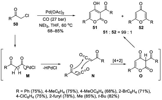 A simple and direct method for the preparation of 3-acyl-4-hydroxy-2-pyrones 51 was described by Perrone et al. []. The carbonylation of α-chloroketones 50 under the action of a palladium catalyst and triethylamine in tetrahydrofuran [] gives 3-alkanoyl- and 3-aroyl-substituted 2-pyrones 51 in high yields (Scheme 12). The byproducts are 4-pyrones 52, but their amount is minimized to 1% in optimal conditions with the use of palladium(II) acetate at 60 °C. The reaction is tolerant of various alkyl and aryl substituents. The authors suggested that the formation of acylketene N occurs through the cleavage of palladium from the product of the carbonylation (intermediate M). The last step is the [4+2]-cycloaddition of the ketene N to give target 2-pyrone 51.