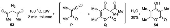 Recently, Castilio et al. showed that 3-diazoacetylacetone 53 transforms to 4-hydroxy-2-pyrone 54 [], which is an important intermediate in the synthesis of natural compounds [,]. Diazoacetylacetone (53) is heated to 180 °C under microwave irradiation in toluene for two minutes, and pyrone 54 crystallizes out of the reaction medium in a total yield of 30%. It is most likely formed as the result of the hydrolysis of the non-isolated intermediate Q, which is the dimer of acetyl ketene P (Scheme 13).