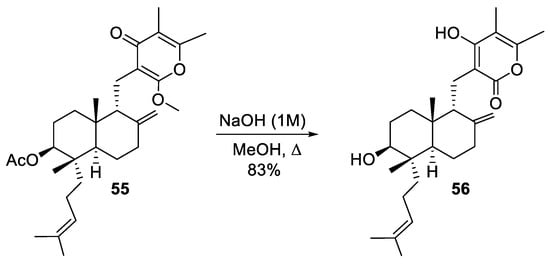 2-Cyano-4-pyrones can be considered as a synthetic equivalent of 4-hydroxy-2-pyrones via ring-opening transformations and elimination of HCN; however, their direct conversion has never been described. The substitution occurs selectively only upon treatment with amines and hydrazines [,]. On the other hand, the transformation of MeO-substituted γ-pyrones under the action of alkali is a general method for the synthesis of 4-hydroxy-2-pyrones (Scheme 14). This approach was used by Kato’s group in the synthesis of (+)-sesquicillin A. (−)-Nalanthalide (55) was heated under basic conditions (1 M NaOH) leading to γ-pyrone hydrolysis and removal of acetyl protection in the non-pyrone fragment, as a result, deacetylated sesquicillin A (56) was prepared in 83% yield [].