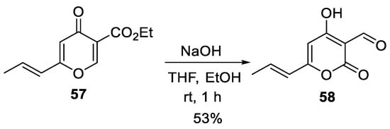 Another approach is based on an ANRORC reaction of 3-carbethoxy-substituted 4-pyrones under the action of a base. Although this reaction was described only in two works [,], it provides access to difficult-to-find 3-formyl-4-hydroxy-2-pyrones. Very recently, it was observed that the reaction of 4-oxo-4H-pyran-3-carboxylate 57 with NaOH proceeded selectively and led to 4-hydroxy-2-pyrone 58 in 53% yield. This transformation presumably occurs through a conjugate nucleophilic addition at the C-2 position of the γ-pyrone ring, followed by pyrone ring opening and then ring closure to produce the stable anion of 58 (Scheme 15).