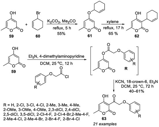 The reaction of triacetic acid lactone (59) with 3-bromocyclohexene 60 in acetone in the presence of potassium carbonate leads to compound 61, which can undergo a Claisen rearrangement under heating in xylene to give the corresponding 3-cyclohexenyl-substituted 4-hydroxy-2-pyrones 62 (Scheme 16) []. Another approach for the modification of the pyrone ring is based on the Fries reaction. Acylation of 59 with phenoxyacetyl chloride leads to O-acylation products R, which are treated without isolation with potassium cyanide in DCM. These pyrones undergo rearrangement to produce 6-methyl-4-hydroxy-3-(2-phenoxyacetyl)-2-pyrones 63 in 41–60% yields [].