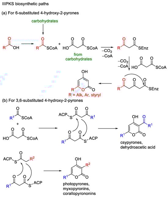 Polyketides are a large class of biomolecules assembled by repeating Claisen-condensations between an activated acylstarter unit and malonyl-CoA-derived extender units [,,,]. In Nature, the synthesis of 4-hydroxy-2-pyrones is catalyzed by polyketidases (PKS), which give chain elongation using structural fragments, such as acetyl-CoA, propyl-CoA, malonyl-CoA and methylmalonyl-CoA, as well as other derivatives of carboxylic acids (Scheme 17) []. The majority of this family of 4-hydroxy-2-pyrones is found to be biosynthesized by type III polyketide synthases (PKSs), which provide a two-step process, including two condensation processes and intramolecular cyclization. III PKS systems were described in plants, fungi and bacteria. In contrast to I PKS and II PKS, III PKS acts independently of the acyl carrier protein (ACP), and acyl CoA is used directly as a substrate (Scheme 17). Although usually 4-hydroxy-2-pyrones as triketides are isolated as by-products in the biosynthesis of complex polyketides [], in some cases, special pyrone synthases, which are a kind of polyketide synthase III, are able to control the final length of a polyketide and responsible for the selective lactonization []. Another important biosynthetic pathway is characteristic of natural 3,6-disubstituted 4-hydroxy-2-pyrones, such as csypyrones, photopyrones, myxopyronins, corallopyrononins and dehydroacetic acid, and is based on the intermolecular cyclization of two acyl carrier protein (ACP)-tethered β-ketoacyl intermediates or β-ketoacyl-ACP with acyl-ACP [,]. This unique process is non-decarboxilative and catalyzed by a special type of ketidases, which are also related to III polyketidases.