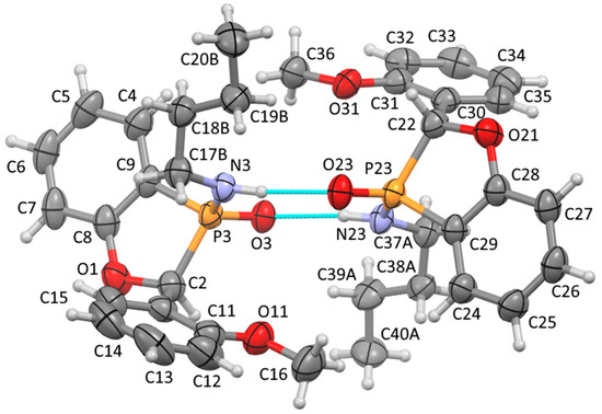 In the case of the ortho-methoxyphenyl compound 23d, crystals suitable for X-ray diffraction were obtained, and the resulting structure (Figure 3) showed two independent but closely similar molecules linked in an R22(8) [24] dimer by N–H···O=P hydrogen bonding. Not unexpectedly, there was significant disorder within the flexible N-butyl groups.