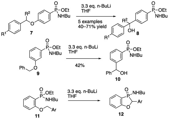 In an earlier paper, we described the synthesis of aryl benzyl ethers bearing the phosphonamidate group EtO-P(=O)-NHBu on the aryl ring, either para- (7) or meta- (9) to a benzylic ether, and their successful Wittig rearrangement to afford the corresponding phosphonamidate-functionalised diarylmethanols 8 and 10, respectively (Scheme 2) [9]. In this paper, we describe the synthesis of a series of the isomeric aryl benzyl ethers 11 bearing an ortho-phosphonamidate group and their reaction with butyllithium, which leads not to Wittig rearrangement but rather to cyclisation, giving 2,3-dihydrobenzo[d][1,3]oxaphospholes 12. Recently, compounds of this type have been of considerable interest as chiral ligands for catalytic asymmetric synthesis, but all the previous synthetic methods involved cyclisation with the formation of the C(2)–O bond [10,11,12,13] as opposed to the method described here where the C(2)–P bond is formed.
