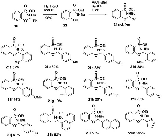 However, it was clear that this approach to accessing a wider range of substituted phosphonamidates was unsatisfactory. Instead, we were able to remove the O-benzyl group from 16 in excellent yield using catalytic hydrogenation to give the hydroxyphenylphosphonamidate 22. This was then O-alkylated to give a range of derivatives, 21a–d and f–m, in varying yields (Scheme 7).