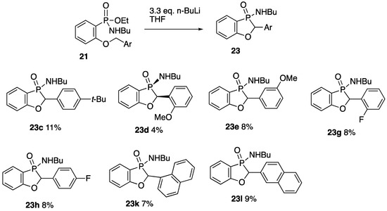 When compounds 21a–m were subjected to treatment with butyllithium under the same conditions as for 16, a varying pattern of reactivity was observed. In each case, a complex mixture of products was obtained, but by using preparative TLC, the cyclised products 23 could be obtained in seven cases (Scheme 8). The final isolated yields were low in all cases, but the spectroscopic data were in good agreement with those already established for 17. The main competing reaction seemed to be O-debenzylation to regenerate compound 22, which was observed in all cases. The reaction was complete within 20 min, and leaving it for longer resulted in reduced yields of 23. The failure of the cyclisation for 21i and 21j was not surprising as the lithium–halogen exchange was expected to occur. Significantly, each benzophosphole product was obtained as a single diastereomer with consistent values of 2JH–P 9.6–12.4 Hz for the 2-CH signal observed at 5.53–5.82 ppm in the 1H NMR spectra and 1JC–P 86.7–87.9 Hz for the corresponding 2-C signal observed at 79.3–80.0 ppm in the 13C NMR spectra. The two N–CH2 protons were also magnetically non-equivalent in each case, leading to two separate multiplets in the 1H NMR spectrum in each case.