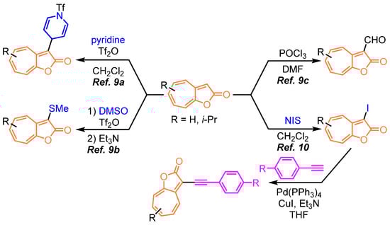 2H-Cyclohepta[b]furan-2-one (CHF) is recognized as one of the heteroazulenes [1], and its functionalized derivatives are known to exhibit inotropic character [2]. In their utilization of these derivatives, Ando et al. have demonstrated that CHFs can be used as starting materials for the total synthesis of natural products [3,4,5]. On the other hand, Nitta and co-workers have reported the synthesis and properties of methylium or tropylium ions connected with CHF [6,7,8,9,10]. As a result, these ions were found to be highly stable and to exhibit an absorption band with a large molar absorption coefficient in the visible region of the UV-visible absorption spectrum. The CHFs can also be effectively converted to azulene derivatives through reactions with olefins [11,12,13] and reactive intermediates, such as enamines [14,15,16,17,18], silyl enol ether [19], and active methylene compounds [20]. Although numerous methods for the conversion of CHFs to azulene derivatives have been documented, the modification method of CHF itself has not been extensively explored. Over the past decade, we have made strides in the electrophilic substitution [21,22,23] and cross-coupling reactions [24,25,26] of CHFs, primarily targeting the highly reactive 3-position (Figure 1).