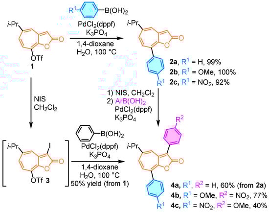 In this study, we have successfully prepared and characterized a series of 3,8-diaryl-2H-cyclohepta[b]furan-2-ones 4a–4c using a one-pot procedure involving sequential iodation and Suzuki–Miyaura coupling.
