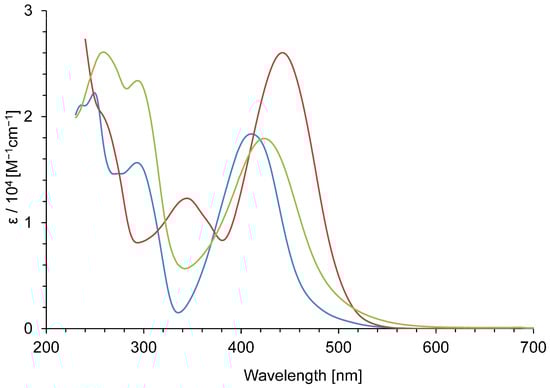 To evaluate the optical properties of the prepared compounds, measurements of their UV/Vis absorption spectra were performed. The absorption maxima and coefficients (log ε) of 4a–4c in CH2Cl2 and 2a–2c as a reference are shown in Table 1. The UV/Vis spectra of 4a–4c are represented in Figure 4.