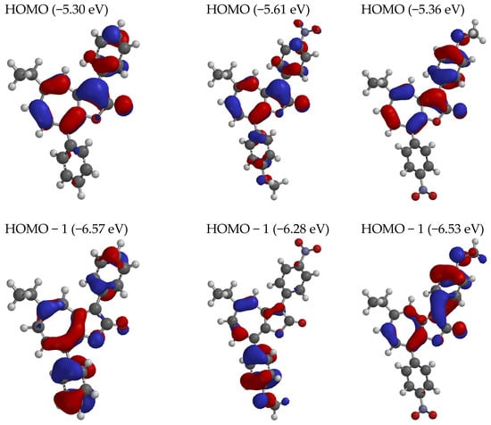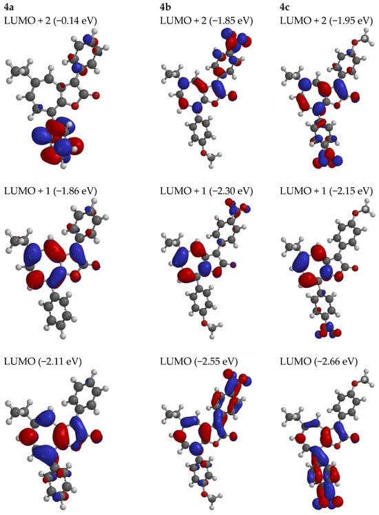 To theoretically elucidate the variations in absorption wavelengths observed in the UV/Vis spectra of 4a–4c, the electronic transitions within the absorption band and the energies of the HOMO and LUMO of these compounds were examined using time-dependent density functional theory (TD-DFT) calculations at the B3LYP/6-31G* level [30]. These methods are employed to optimize the molecular geometries, calculate the electronic excitation energies, and determine the UV/Vis absorption spectra. The electronic transitions of 4a–4c, as determined from the calculations, are summarized in Table 1. Figure 5 represents the frontier Kohn–Sham orbitals of 4a–4c along with their corresponding energy levels.
