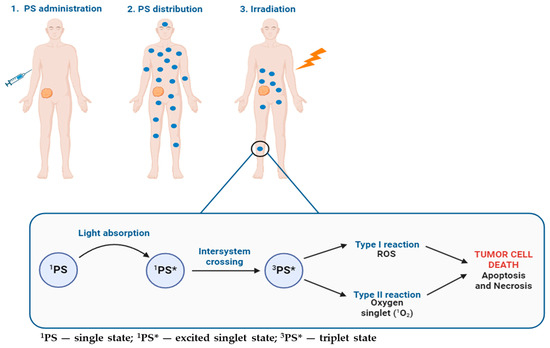 When the cells that have absorbed photosensitizers are exposed to a specific wavelength of light, reactive oxygen species (ROS), which can induce the selective destruction of the target tissue, are produced [15,16]. Upon light absorption, the photosensitizer (PS) transitions from its ground state (singlet state, 1PS) to an excited singlet state (1PS*). This excited singlet state is very unstable and, consequently, can progress to a more stable, long-lived, electronically excited state: the triplet state (3PS*) [8,14,15]. Moreover, the photosensitization process encompasses two processes that occur in parallel, and the ratio depends on the PS used, the concentrations of oxygen and substrate, and the affinity of the PS with the substrate. Specifically, in the Type I photosensitization process, the triplet state directly engages with a substrate (such as a cell membrane or molecule) and undergoes reactions involving hydrogen atom abstraction or electron transfer, leading to the generation of free radicals and radical ions. When these radicals react with molecular oxygen, ROS are produced, inducing oxidative damage and cell death. In Type II reactions, the PS in its excited triplet state transfers its energy to molecular oxygen leading to the formation of singlet oxygen (1O2), its highly reactive and cytotoxic singlet state [7,13,17]. Figure 1 shows the principle of PDT and a schematic illustration of PS activation for treating a solid tumor.