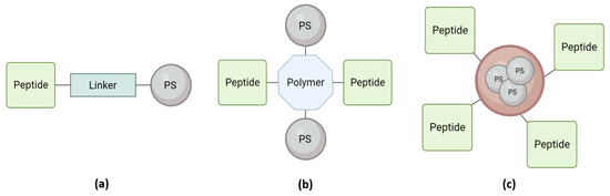 As stated before, peptides have been explored as PS carriers due to their biocompatible and biodegradable characteristics and their easy design, synthesis, and purification. In addition, peptide–PS conjugates allow better accumulation of the PS at the site of action, ensuring in situ generation of ROS and enhancing therapeutic efficacy. This reduces the dose of PS used, decreasing its toxicity and reducing side effects [44]. However, these peptide-based conjugates have an inherently low resistance to enzyme-mediated degradation and, therefore, need to be modified. This modification could be achieved using D-amino acids, pseudo-amino acids, and peptide cyclization, increasing the stability of the peptide. The peptide could be attached directly to the PS via a linker or incorporated into the composition of more complex delivery systems, such as binding to nanoparticles (NPs) (Figure 2) [31,44,45,46,47]. Below, several peptide–PS conjugate approaches will be reviewed.