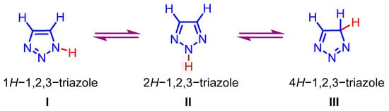 The 1,2,3-triazole scaffold is a highly potent nitrogen-containing heterocyclic structure that has found numerous applications [13]. It is an unsaturated, π-excessive, five-membered heterocycle with a 6π-electron delocalized ring system, imparting it with aromatic character. This framework can be readily synthesized via click chemistry, involving the reaction of an aryl/alkyl halide, alkynes, and NaN3 [14,15]. The 1,2,3-triazole molecule consists of three adjacent nitrogen atoms and two carbon atoms, all of which are sp2-hybridized. One nitrogen atom resembles pyrrole nitrogen, while the other two resemble pyridine nitrogen (Scheme 1). Over the past few decades, numerous synthetic methodologies have been developed, typically categorized into metal-free and metal-catalyzed approaches. These advancements provide new opportunities for incorporating this valuable moiety into biologically relevant compounds designed and developed by medicinal chemists. Unsubstituted 1,2,3-triazole exists in three distinct tautomeric forms (I, II, and III) (Scheme 1). Dipole moment measurements suggest that 83% of the equilibrium for 1,2,3-triazole favors the symmetrical 2H-1,2,3-triazole (II) form [16]. This property enhances the versatility and complexity of triazole’s chemical behavior, significantly impacting various chemical reactions and processes.