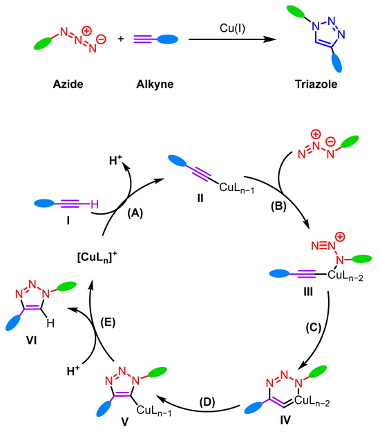 The thermal cycloaddition of azides and terminal alkynes is the most common method for synthesizing 1,2,3-triazole. Nevertheless, this technique has several limitations, including issues with regioselectivity, the need for high temperatures, and low yields. In 2001, Sharpless introduced Cu-catalyzed azide–alkyne cycloaddition (CuAAC) to overcome these issues, enabling the synthesis of 1,2,3-triazole with high yields and exceptional regioselectivity [17,18]. The reaction mechanism of copper(I)-catalyzed 1,3-dipolar cycloaddition was proposed by Sharpless (Fokin et al. [15,19]) (Scheme 2). The increased reactivity of alkynes in the presence of copper(I) is due to the formation of a copper acetylide (A). Subsequently, the azide binds to the complex by substituting a ligand with the nucleophilic nitrogen (B), thus forming the metallacyclic species (C). The 1,2,3-triazole is formed by the contraction of the metallacycle upon the attack of the nitrogen lone pair on the carbon (D), followed by the protonation of the copper derivative, thereby regenerating the catalyst (E). The metalation of the azide by copper leads to the formation of the intermediate (III), where the copper atom is in the II oxidation state. This intermediate undergoes cyclization to form a six-membered metallacycle (IV), with the copper atom transitioning to the III oxidation state. The contraction of this metallacycle to compound (V) constitutes the final step of the catalytic cycle, with the copper atom returning to the I oxidation state. The protolysis of the organocuprate (V) yields the 1,4-disubstituted 1,2,3-triazole (VI) (Scheme 2).