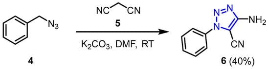 In their research study, Cao et al. [21] described the synthesis and characterization of 1,2,3-triazole derivative (6). The synthesis involved reacting malononitrile (5) with (azidomethyl)benzene (4) in DMF, using K2CO3 as the base. The mixture was stirred at room temperature overnight, yielding 1,2,3-triazole in a 40% yield (Scheme 4).
